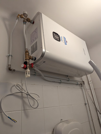 Pose dun chauffe-eau et meuble de salle deau. Raccordement de plomberie et écoulement. Travail sérieux avec le sourire.